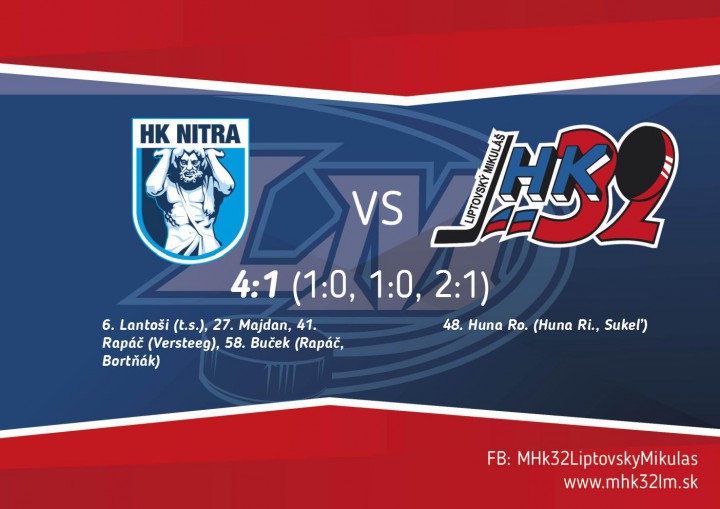 Nitra sa proti nám v prvej tretine nedostala k žiadnemu tlaku. Dobrým pohybom a organizáciou hry sme eliminovali zbrane domácich. Naša snaha vyústila do chyby nitrianskej obrany, no Žiak z dobrej pozície zazvonil iba o žrď Šimbochovej bránky. V 6.minúte využil svoj skvelý pohyb domáci Lantoši a po jednej z mála pekných ofenzívnych akcií vybojoval trestné strieľanie, ktoré aj sám chladnokrvne premenil. Z prvej tretiny to však bolo všetko.