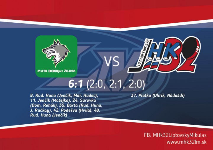 V pre Žilinu existenčnom šesťbodovom súboji sa hral v úvodnej časti svižný hokej bez zbytočného prerušovania. "Vlci" boli o čosi lepším tímom a aktivitu z úvodných minút premenili na prvý gól v 8. min, keď Jenčík poslal do jazdy puk Rudolfovi Hunovi a ten strelou po ľade prekonal Šimka. O tri minúty už bolo 2:0, keď z obrany podporil útok Matejka, z pravej strany prihral nabiehajúcemu Jenčíkovi, ktorý bez prípravy po druhý raz rozvlnil sieť Liptákov. Domáci mali potom k dispozícii presilovku, ale rovnako ako neskôr hostia ju nedokázali využiť.