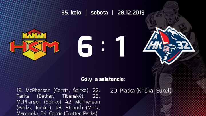 Góly: 19. McPherson (Corrin, Špirko), 22. Parks (Betker, Tibenský), 25. McPherson (Špirko), 42. McPherson (Parks, Tomko), 43. Štrauch (Mráz, Marcinek), 54. Corrin (Trotter, Parks) - 20. Piatka (Kriška, Sukeľ)