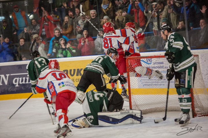 Tretia tretina bola z obidvoch strán opatrnejšia ako tie dve predtým. Mužstvá si uvedomovali, že ďalší gól môže byť rozhodujúci. Domáci chceli pretaviť svoju aktivitu na gól, ale to aj hostia svoje brejky. Nakoniec sa predsa rozhodlo v riadnom hracom čase. V závere stretnutia dostal Krčula trest za vysokú hokejku a zimák stŕpol. Liptáci úspešne bránili oslabenie vyše dvoch minút, ale nakoniec to nevyšlo. Chovanovu odrazenú strelu od zadného mantinelu upratal do siete Hudec a rozhodol o osude stretnutia a semifinálovej série dvadsaťšesť sekúnd pred koncom zápasu. Na zimáku nastalo ticho, ktoré prerušovali len hosťujúci fans. Domáci sa už nezmohli na nič, a tak sa na Liptove, na smútok najvyššej návštevy sezóny prvej hokejovej ligy sezóna skončila.