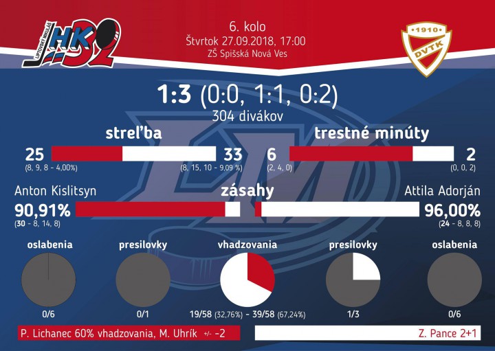 Na zápas proti Miškolcu, ktorý sa odohral na ľade spišskonovoveského zimného štadióna, nebudeme spomínať v dobrom. Už po pár sekundách od začiatku zápasu mal dobrú šancu Pance, ktorý ale nedokázal dostať puk do poloprázdnej Kislitsynovej brány. Maďarský tím pokračoval v útočnej aktivite, no Galanisz a ani Ritó nedokázali prekonať Kislitsyna. V závere prvej časti mal otvárací gól na hokejke Harrison, ten ale z blízkosti poslal puk iba do žrde.