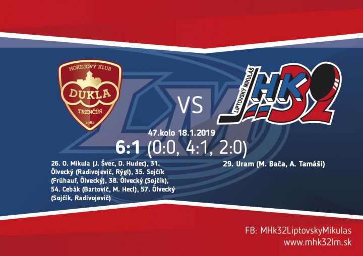 Ani úvod druhej tretiny neprinášal gólové momenty. Až v 26.minúte sa Trenčínu vyplatil dôraz. Švecova strela zblízka vypadla Hollému a dobiehajúci Mikula ju poslal do siete. Domáci hokejisti chceli v eufórii pridať i druhý gól. Strelám Sádeckého a Rýgla však chýbala presnosť. O tri minúty bolo vyrovnané. Valent vyrazil puk pred Urama, ktorý mal dostatok času a priestoru na to, aby ho poslal pod hornú žŕdku. Dukla sa snažila čo najrýchlejšie vrátiť vedenie na svoje hokejky a aj sa jej to podarilo. V 31.minúte Radivojevičovu strelu nechytateľne tečoval Ölvecký. V 35.minúte sa opäť presadila prvá trenčianska formácia. V neprehľadnej situácii dotlačil puk za čiaru Sojčík. Gólostroj Dukly pokračoval už o tri minúty. Nikým neatakovaný Ölvecký vystrelil na lapačku Hollého a puk sa zatrepotal v sieti.