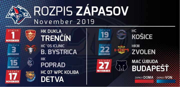 Po prvej reprezentačnej prestávke, sa Vám, našim fanúšikom, predstavíme do konca novembra na domácom ľade našej „Kôlničky“ v dvoch zápasoch. Zápas proti Košiciam absolvujeme hneď zo začiatku decembra. Prvý domáci zápas v „Kôlničke“ po prestávke odohráme v nedeľu 17.11. proti Detve. Nasledovať bude zápas proti Budapešti 27.11. Tretí decembrový deň privítame Košice.