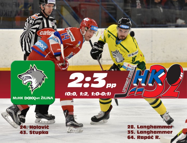 MsHK Žilina - MHk 32 Liptovský Mikuláš 2:3 pp (0:0, 1:2, 1:0-0:1)