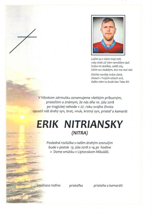 Posledná rozlúčka s Erikom bude v piatok 13.júla o 14:30 v Dome smútku v Liptovskom Mikuláši.
