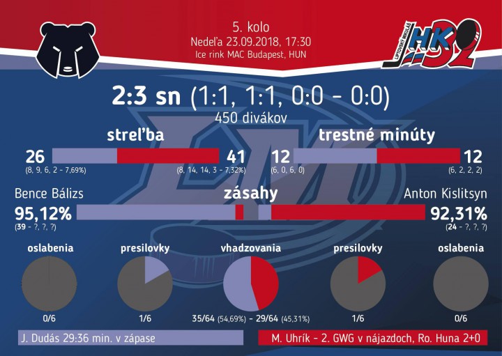 Do tretej tretiny sme vstúpili aktívne, ale Lichanec, Suekľ či opäť Róbert Huna svoje šance nevyužili. V 53.minúte mohli ísť do vedenia hráči MAC Budapešť počas hry vo vlastnom oslabení, veľkú šancu však nepremenili a duel skončil v riadnom hracom čase remízov a diváci si mohli pozrieť predĺženie. Počas piatich minút extra času sa taktiež nerozhodlo, aj napriek presilovke domácich a víťazný gól padol až v samostatných nájazdoch. Po úspešnom nájazde Róberta Hunu dokázali domáci odpovedať, ale Michal Uhrík posledným nájazdom rozhodol o tom, že druhý bod putuje na Liptov.