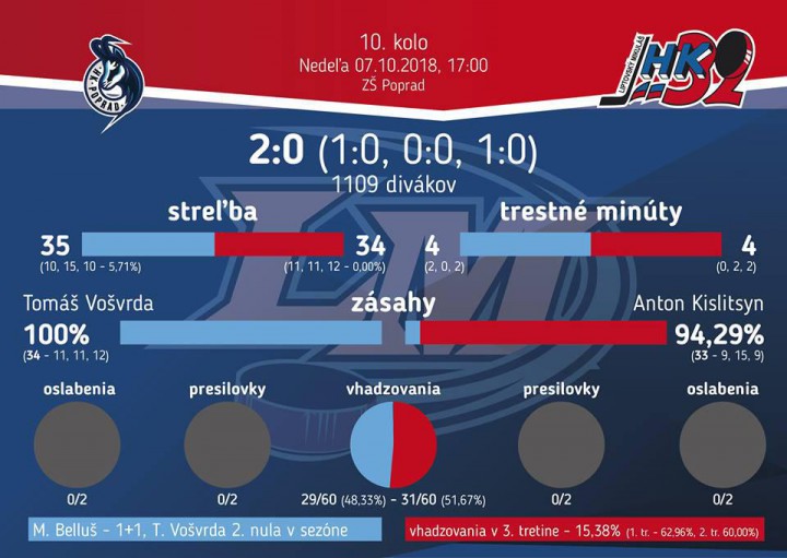 Gólová poistka domácich prišla v 41.minúte. Prepadli sme v útoku a na brankára Kislitsyna sa rútila dvojica domácich. Domáci útočník sa rozhodol situáciu vyriešiť strelou, ktorá zapadla do odkrytej časti bránky. Napriek snahe sme sa v útoku nedokázali presadiť a už druhý zápas po sebe sme nevsietili ani jeden gól. Zvrátiť nepriaznivý vývoj stretnutia nepomohla ani naša záverečná hra bez brankára. Naopak, pre popradského gólmana Vošvrdu to bola druhá vychytaná nula v sezóne.