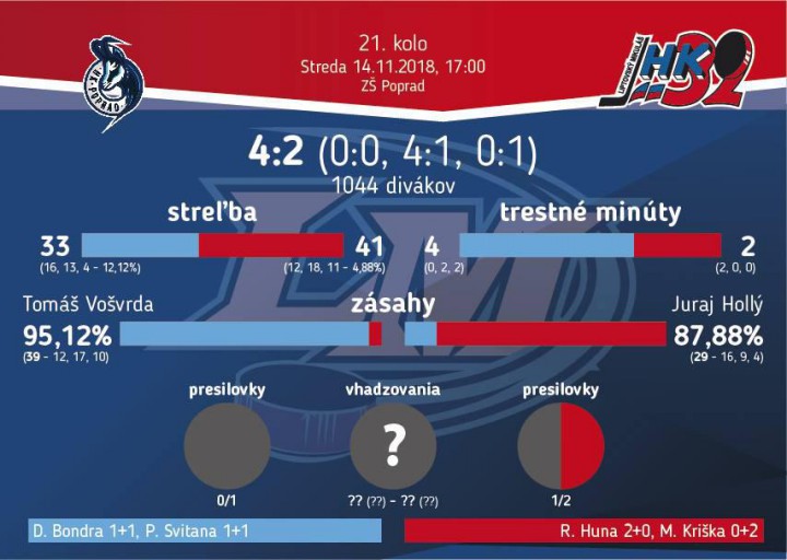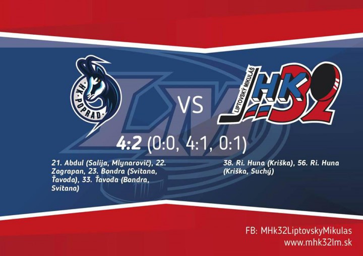 Do tretej tretiny vstúpili naši chlapci aktívne. Snažili sa tlačiť pred súperovu bránku a okresať súperov náskok. Aj napriek veľkej snahe, veď do polovice tretej tretiny sa hra odohrávala vo veľkej miere v obrannom pásme Popradu, sa našim chlapcom podarilo znížiť až v 56.minúte. Po krásnej akcii a kombinácii trojice Kriška, Suchý a Richard Huna posledne menovaný pridal do práznej bránky svoj druhý gól v zápase. V poslednej dvojminútovke ešte pri vylúčení Svitanu odvolal tréner Tomko Hollého, a naši chlapci si zahrali presilovku o dvoch hráčov. Ani tá ale neviedla ku kontraktnému gólu. Z Popradského ľadu sme tak cestovali domov bez bodu.