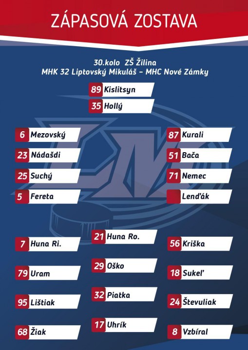 Zostava v dnešnom zápase bude nasledovná: Kislitsyn (Hollý) – Mezovský, Kurali, Nádašdi, Bača, Suchý, Nemec, Fereta, Lenďák – Kriška, Huna Ri., Huna Ro., Uram, Oško, Sukeľ, Števuliak, Piatka, Lištiak, Vybíral, Uhrík, Žiak
