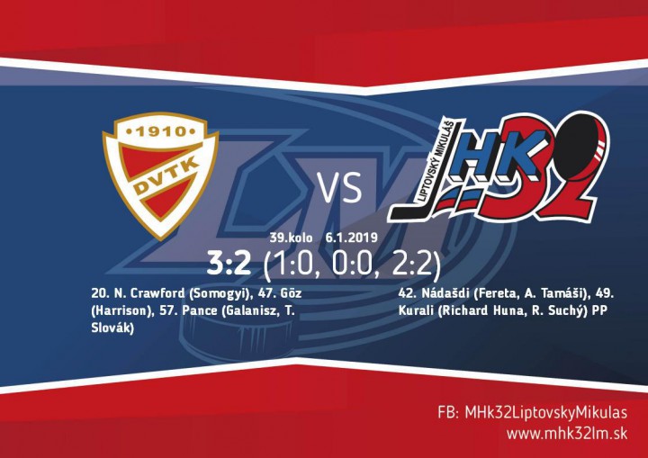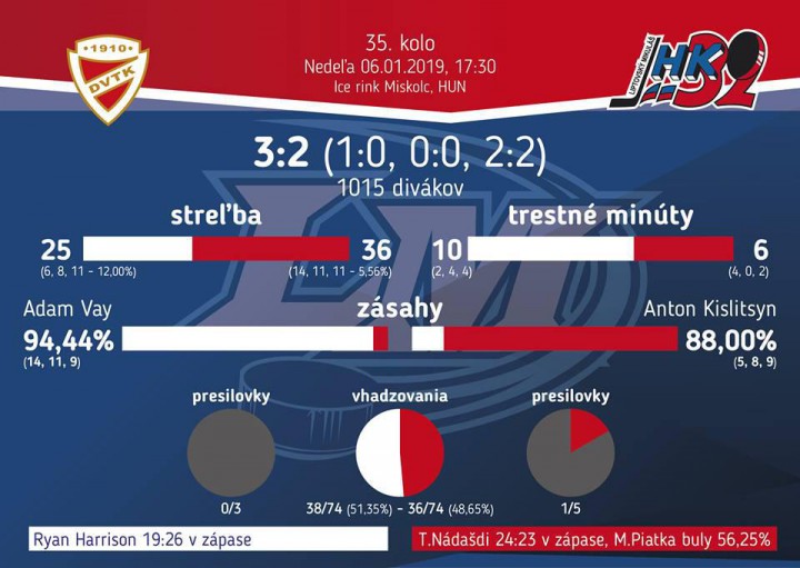 Vyrovnanie prišlo v 42.mnúte. Nádašdiho strela od modrej zapadla až do siete domáceho brankára. Vynikajúcu robotu odviedol cloniaci Varga. V 47.minúte prinavrátil vedenie domácim Goz, keď využil prihrávku spoza bránky a nikým nekrytý poslal puk popri betóne Kislitsyna do siete. V 49.minúte už bol stav ale opäť vyrovnaný. Kurali v presilovke dotlačil puk spred bránkového priestoru až za čiaru a radosť bola veľká. Potom prišla šanca domáceho celku na ktorú odpovedal rovnako strelou spomedzi kruhov Robo Huna. Rozuzlenie zápasu prišlo v 57.minúte. Pance strelil už svoj 15.gól v sezóne a uzavrel skóre zápasu. Hra bez brankára našim nevyšla a ďalšia smolná prehra o jeden gól bola na svete.